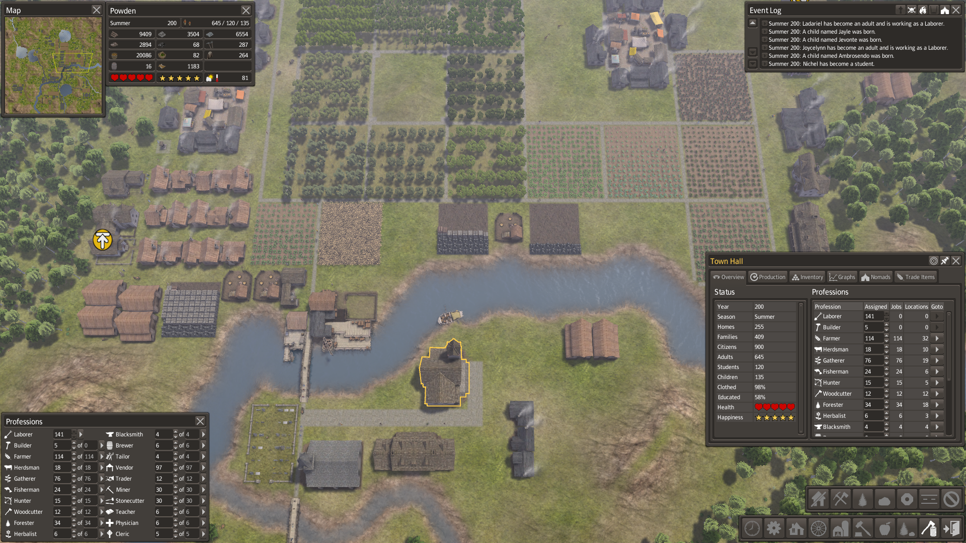 Wie man sieht, sind mir am Ende die Werkzeuge ausgegangen, weil ich nicht genug Eisen gefördert habe. Ich habe dem aber nur wenig entgegengesteuert, da die Zeit für das Achievement fast um war und ich ganz rücksichtslos darauf hin gespielt habe. Nachdem ich den ersten Winter gut überstanden habe, genug Feuerholz produziert wurde und ein Schmied sowie Schneider da waren, habe ich versucht so schnell wie möglich ein Bevölkerungswachstum hervorzurufen. (Mit dem Hintergedanken, dass es egal ist, wenn ein paar (viele) Leute draufgehen, so lange man genug Nachschub hat und die Versorgung einigermaßen passt.) Primär habe ich die Expansion mit Sammler, Förster, Jäger + 5 Hütten vorangetrieben. Nach der ersten Expansion kamen auch noch zwei Fischer dazu. Nach der zweiten Expansion kam der Steinbruch (+ 5 Hütten), weil Steine langsam rar wurden. Ich hatte zu dem Zeitpunkt ca. 5000 Nahrung und ein Plus von etwa 500 Nahrung/Jahr. Ich habe dann (etwa 10 Jahre nach Überschreiten der 50-Leute-Grenze) noch zwei Fischer gebaut und bin innerhalb von zwei Jahren in eine arge Hungersnot gekommen. Dadurch sind um die 40 von über 100 Leuten gestorben. Eindämmen konnte ich das durch das Einstellen der Fischertätigkeit und einem weiteren Expansions-Punkt mit Sammlern. Merke: wenn man Fischer haben will, sollten mindestens Hütten in der Nähe stehen, besser auch noch ein Lager. Nach dem Schock zur Halbzeit brach dann auch noch eine Epidemie aus, weshalb ich schnell noch ein Krankenhaus bauen musste. Aber immerhin ging es mit der Nahrung wieder aufwärts. Nach nur 5 Jahren waren wieder 8000 Einheiten verfügbar und die Bevölkerung wieder auf etwa 80 Leute angewachsen. Jetzt ging Eisen und damit auch die Werkzeuge zu neige, weshalb ich angefangen habe Minen zu bauen. Die fördern allerdings so wenig zu Tage, dass ich etwa anderthalb Jahre vor Ablauf der Frist das letzte Werkzeug rausgegeben habe. Dann habe ich den gehofft und gewartet während immer weniger Leute vernünftiges Werkzeug für ihre Arbeit hatten und damit alles so langsam den Bach runter ging. Die gesunkene Produktion von Nahrung ließ das Polster dahinschmelzen, es wurde nicht mehr genug Holz und damit auch nicht genug Feuerholz produziert, so dass es in den meisten Hütten kalt blieb. Und natürlich konnten dadurch auch keine neuen Werkzeuge und Kleidung mehr hergestellt werden. Das Schicksal wollte ich den Bewohnern ersparen und habe mit Erreichen des Achievements die Zeit gestoppt. ;-)