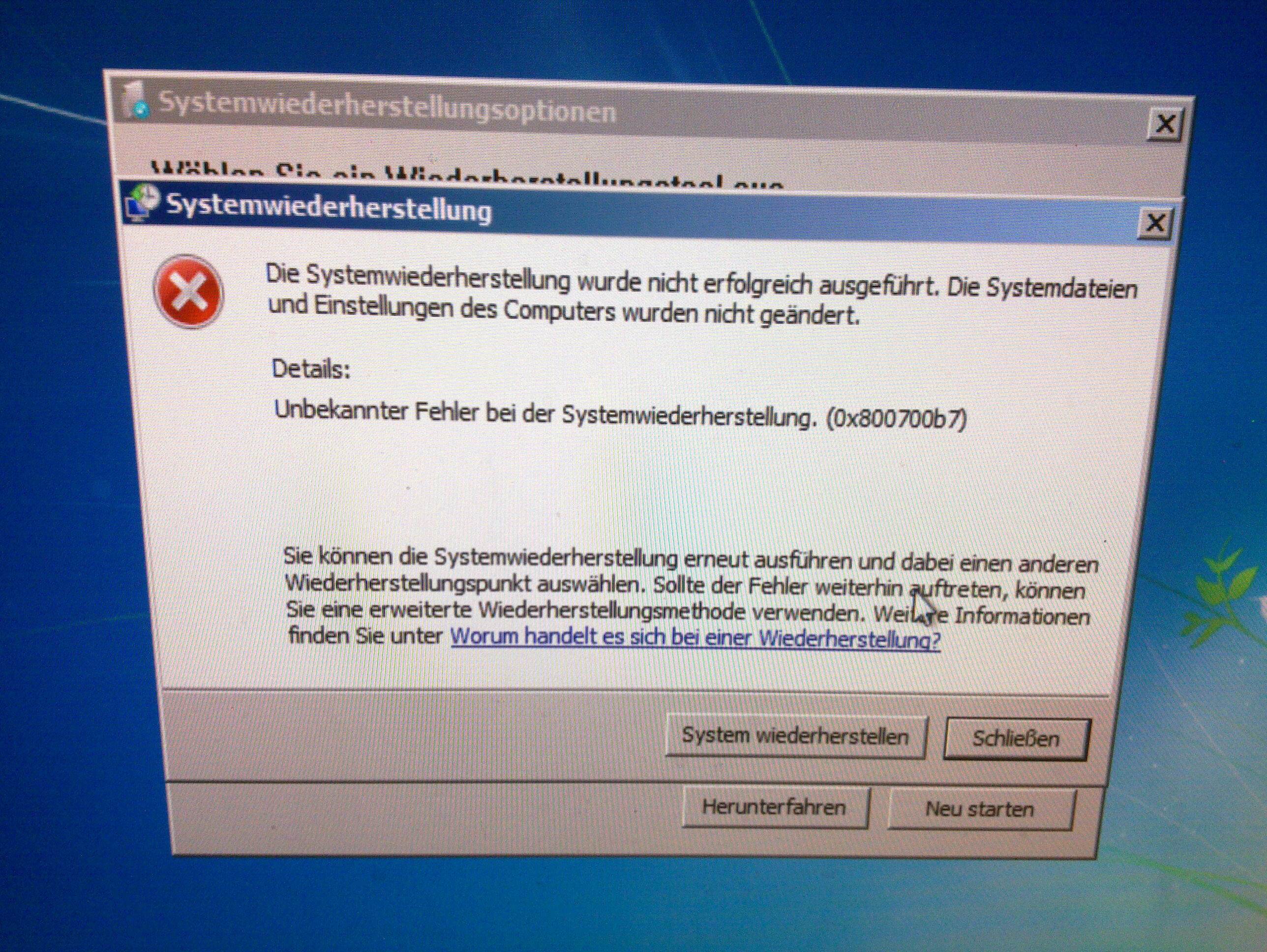 Klappt ja prima. Jedenfalls startete Windows 7 nach der Reparatur überhaupt nicht mehr. Ich versuchte andere Rücksetzpunkte und Wiederherstellungsoptionen mit immer dem selben Ergebnis. Irgendwann meldete Windows dann doch einen erfolgreichen Start, hatte aber immer noch Kästchen statt Buchstaben. Ich hätte jetzt zu einer Neuinstallation geraten, aber nachdem Windows zumindest lief und man Spiele starten konnte, wollte es mein Bruder dabei belassen.